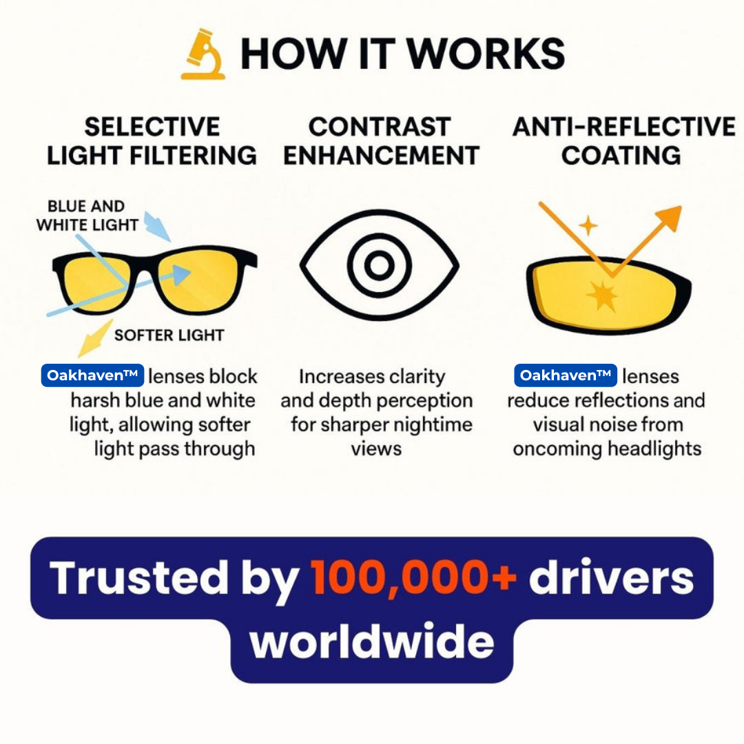 Oakhaven™ isn't just a pair of tinted glasses – it's advanced optical technology designed to filter out the most dangerous part of nighttime driving: headlight glare. Whether from LED or high-beam headlights, sudden flashes of light can distort your vision, slow your reaction time, and in